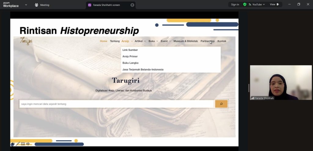 Narasumber menyampaikan bahwa terbuka peluang-peluang wirausaha yang didasarkan pada keilmuan sejarah. Dalam melakukan kerja-kerja histopreneurship perlu memperhatikan konsistensi, strategi, dan pendanaan operasional. Aspek-aspek tersebut telah diaplikasikan oleh narasumber selama bergiat di tarugiri.org.